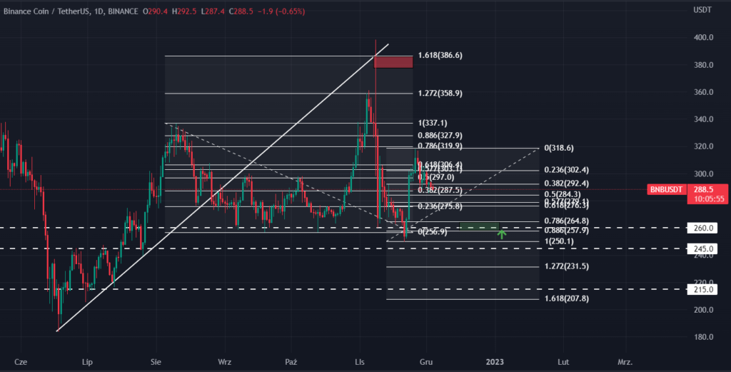 Binance Coin (BNB) na wykresie dniowym zrealizował zapowiadaną prognozę i odbił się od 1.618 mierzenia Fibonacciego – notując potężny spadek w pierwszej połowie listopada.