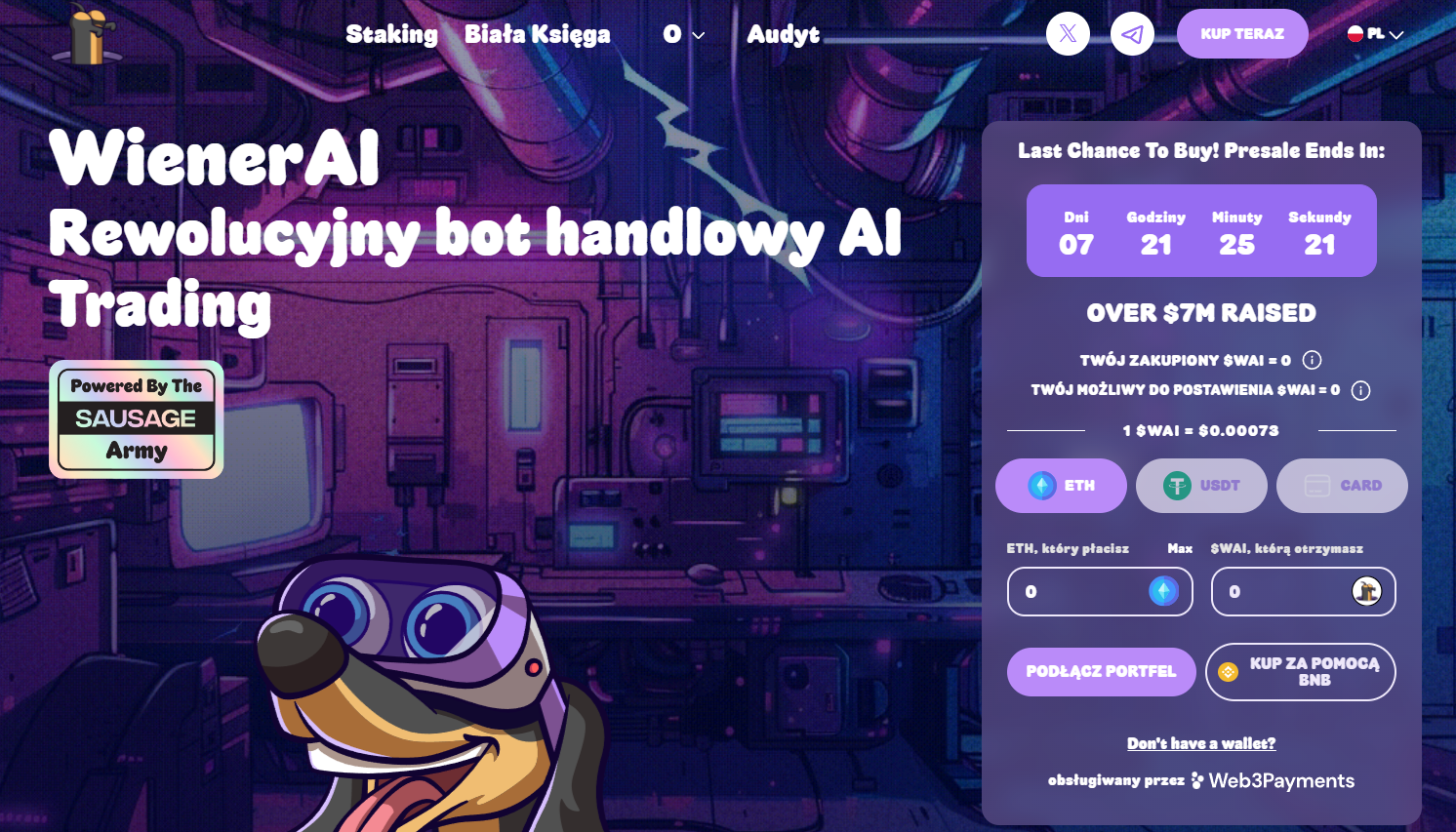 Eksperci oceniają potencjał wzrostowy WienerAI bardzo wysoko. Na przedsprzedaż przeznaczono około 20,7 miliarda tokenów $WAI. Inwestorzy, którzy nie wzięli jeszcze udziału nie mają tego tokena w swoim portfelu mogą odwiedzić stronę WienerAI i połączyć swój portfel kryptowalutowy, aby kupić tokeny dzięki ETH, USDT lub BNB. Akceptowane są również karty kredytowe i debetowe.
