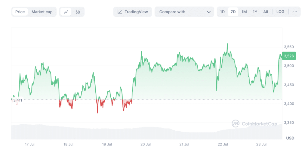 Cena $ETH wzrosła z 3 395 USD do 3 500 USD w ciągu weekendu i w tej chwili znajduje sie w trendzie bocznym czekając na dzisiejsze wydarzenia.
