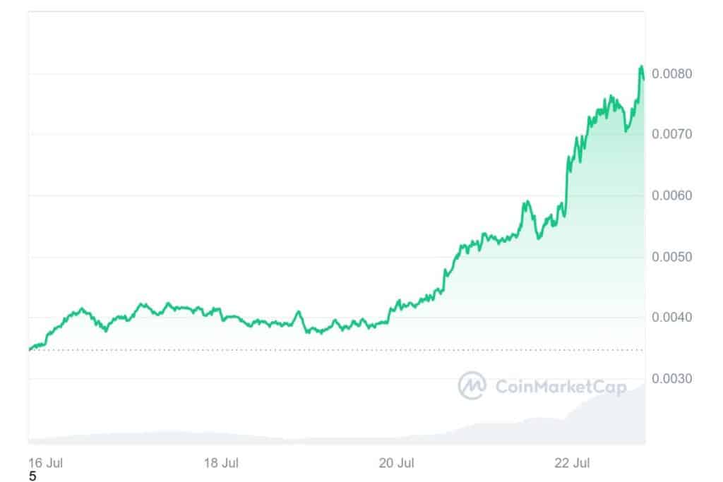 Poniższy wykres pokazuje, iż kurs $MEW wzrósł o 127,97% tylko w ciągu ostatniego tygodnia.