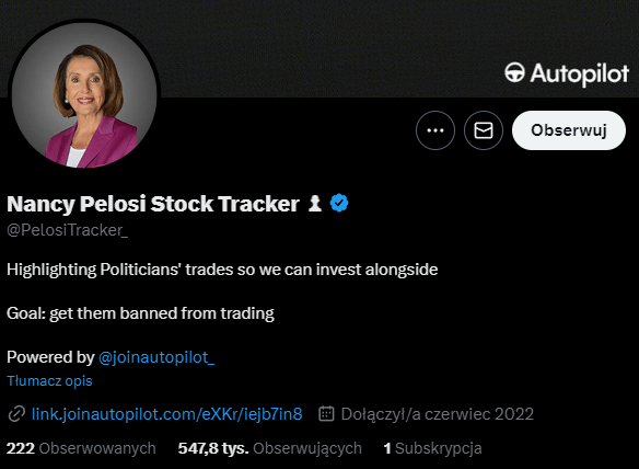 Warto też honorowo wspomnieć o kongresmence z ramienia Partii Demokratycznej, Nancy Pelosi, która w środowisku inwestycyjnym jest żartobliwie nazywana „najlepszym traderem w historii”. Wszystko z powodu jej historii bardzo celnych typów na rynku akcji, które często powiązane są z działaniami rządu USA. Doczekała się choćby swojego specjalnego giełdowego trackera, który na bieżąco monitoruje co znajduje się w jej portfelu akcji. Konto ma aż ponad pół miliona obserwujących na platformie X (Twitterze).