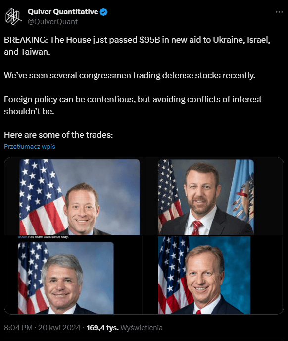 Jak informuje platforma Quiver Quantitative zajmująca się monitorowaniem rynków finansowych, wielu amerykańskich polityków nabywało w ostatnim czasie akcje firm zbrojeniowych, co budzi podejrzenia o tzw. insider trading, czyli podejmowanie decyzji inwestycyjnych na podstawie informacji poufnych. Politycy ci mieli dokonywać zakupu akcji nierzadko w „zbyt przypadkowych” momentach.