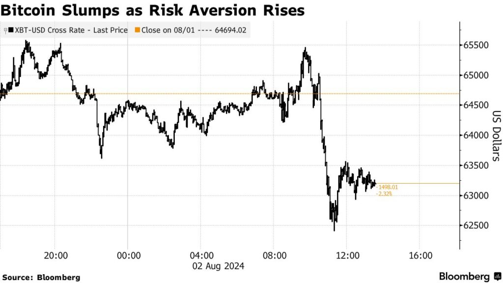 Bitcoin spadł wraz ze wzrostem awersji do ryzyka na indeksach giełdowych. Źródło: Bloomberg