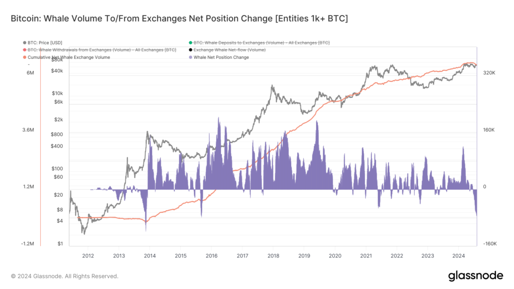 „Portfele wielorybów (>1K BTC), w tym spotowe fundusze ETF i portfele powiernicze, dodały w tym roku łącznie 1,8 mln BTC. W 2021 r. w ciągu roku napływało około 70 tys. BTC; teraz jest to 100 tys. BTC „tygodniowo”, wskazywał CEO platformy analitycznej on-chain. Według danych Glassnode, na dzień 1 sierpnia 1 651 adresów wielorybów posiadało co najmniej 1 000 BTC, w porównaniu z 1 498 na początku roku.