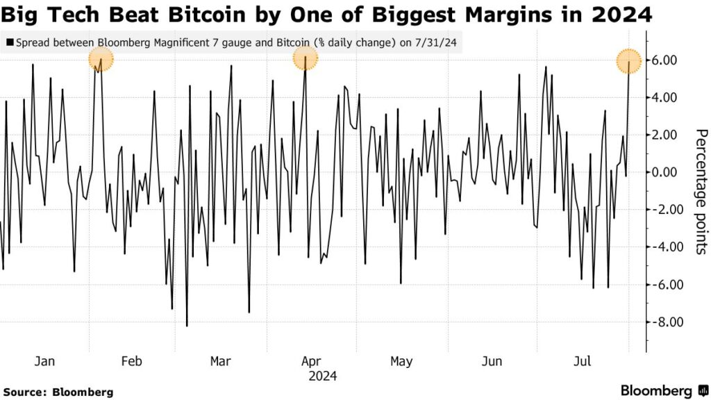 Rekordowa sesja amerykańskich funduszy akcji Mag7 z 31 lipca przyniosła dominację Bitcoina, ale… Nie trwała długo. Źródło: Bloomberg