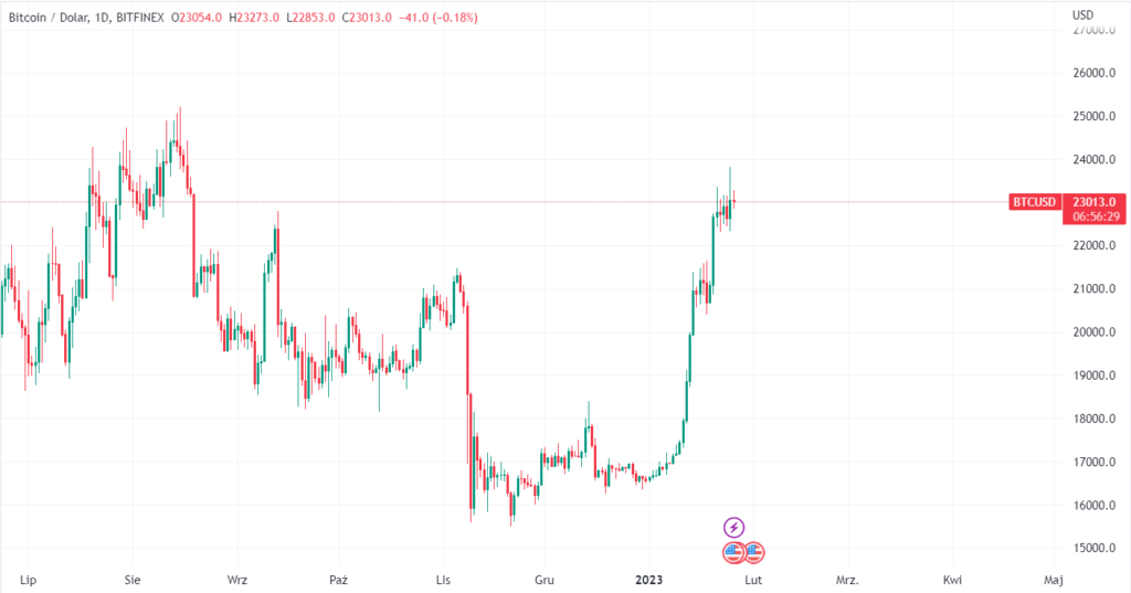 — TechDev (@TechDev_52) January 26, 2023TechDev przedstawił swoje prognozy, które są bardzo optymistyczne. Uważa, iż Bitcoin może choćby przekroczyć granicę 50 000 USD. Na wykresie porównał Bitcoina ze złotem w stosunku do indeksu dolara amerykańskiego (DXY). Metal szlachetny, jak zasugerował TechDev, kontynuując poprzednie ruchy, może być przewodnikiem dla Bitcoina na przyszłą hossę.