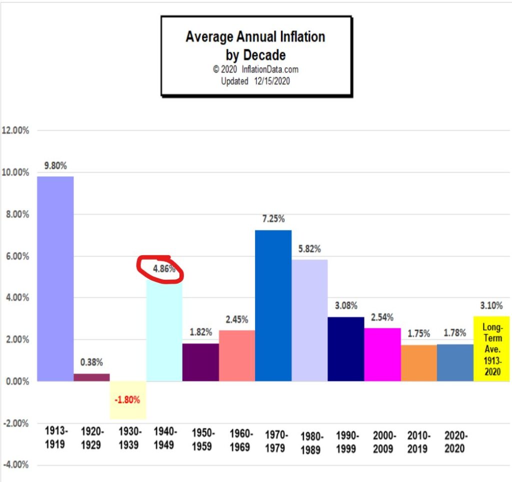 Patrząc na średnią stopę inflacji w USA na przestrzeni ostatnich ponad 100 lat możemy dojść do wniosku, iż niska średnia stopa inflacji w ostatnich latach była raczej anomalią niż normą. Dekada lat 20, XX-wieku rozpoczęła się wejściem w okres inflacji, podobny do wojennego okresu 1913-1919 po którym nastąpiła wielka dezinflacja i spekulacyjne szaleństwo Wall Street zakończone finalnie krachem i Wielkim Kryzysem 1929 roku.