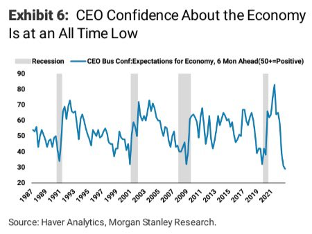Patrząc na wykres widzimy, iż obniżki stóp procentowych przez Fed miały miejsce zwykle na chwile przed krachem indeksu S&P 500. Argumentować można to faktem, iż Fed zwykle jest skłonny do pivotu dopiero gdy gospodarka naprawdę ma się bardzo źle i choć w tej chwili inwestorzy negatywnie reagują na mocne dane z gospodarki, nie od dziś wiadomo iż w gruncie rzeczy silna gospodarka to nawóz zdrowej hossy na Wall Street. Czy naprawdę powinniśmy spodziewać się giełd na nowych szczytach w recesyjnym otoczeniu? Wydaje się to brzmieć niczym myślenie życzeniowe.Kolejny cios, który nie wróży nic dobrego to historycznie największa niepewność prezesów spółek co do przyszłej kondycji gospodarki.