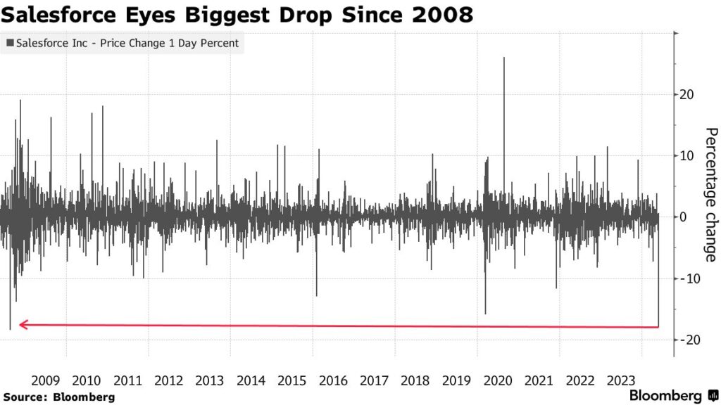 Salesforce ma za sobą najsłabszą sesję od 2008 roku. Źródło: BloombergAkcje odnotowały dziś największy, jednodniowy spadek od prawie 20 lat. Najgorszym dniem handlowym w historii był 4 lipca 2004 r., Kiedy to akcje spadły o 27% zaledwie kilka dni po wejściu spółki na giełdę. W 2008 roku akcje firmy spadały o prawie 21%. W kwartale skończonym w kwietniu, Salesforce odnotował 11% wzrost przychodów, które osiągnęły 9,13 mld USD (oczekiwano 9,17 mld USD) i 44% wzrost zysku na akcję, który w I kw. wyniósł 2,44 USD przy akcjach wycenionych na ponad 270 USD.