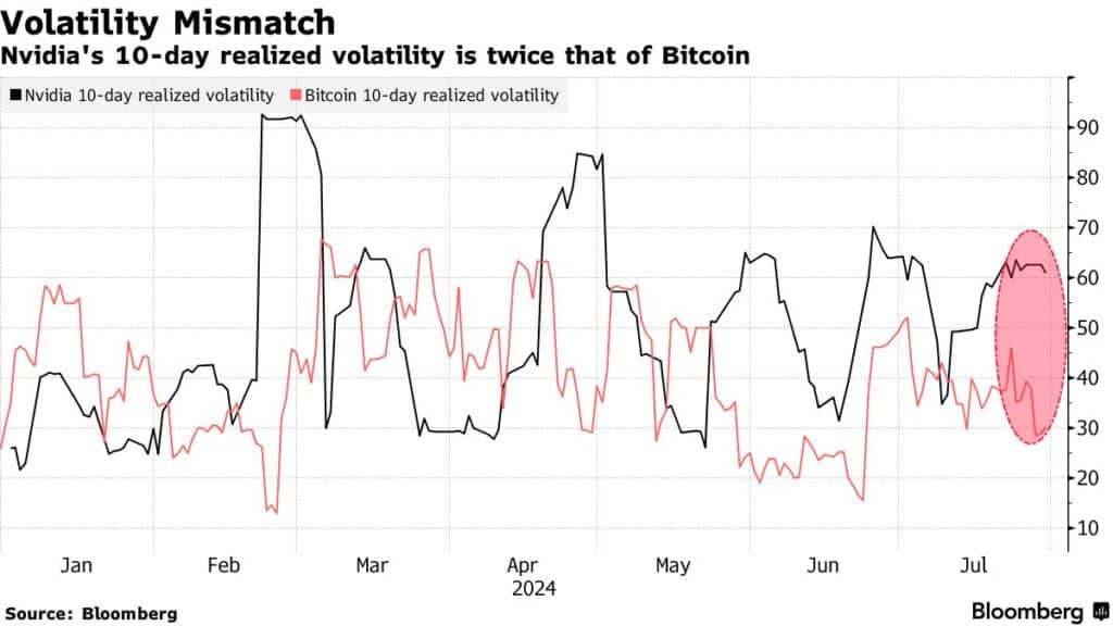 Zrealizowana 10-dniowa zmienność Nvidia jest w tej chwili zdecydowanie większa, niż ta Bitcoina. Źródło: Bloomberg