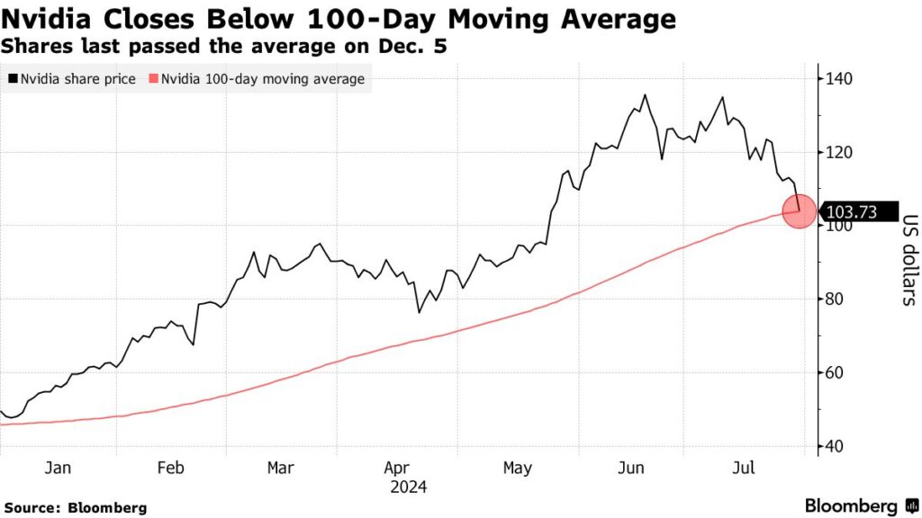 Akcje Nvidia zanurkowały poniżej 100 dniowej średniej kroczącej, na sesji 30 lipca 2024 roku. To daje potężny spadek z blisko 138 USD obserwowanych jeszcze w lipcu. Źródło: Bloomberg