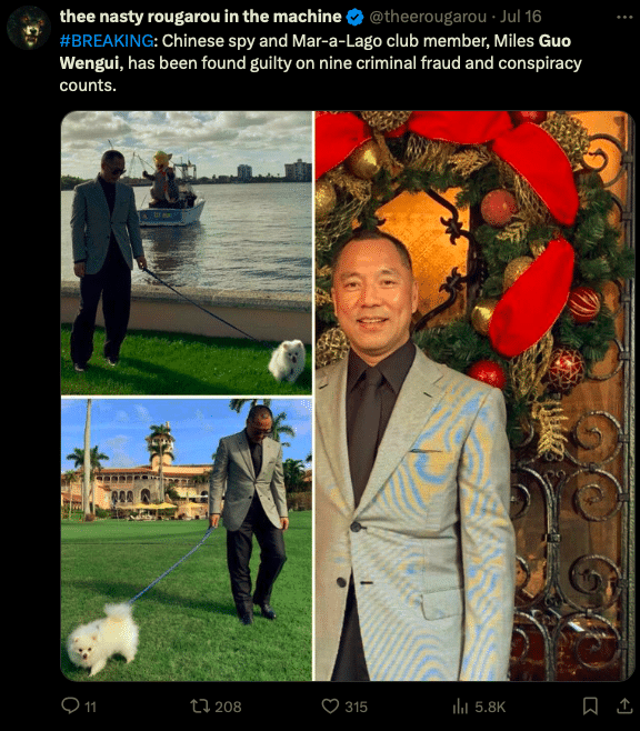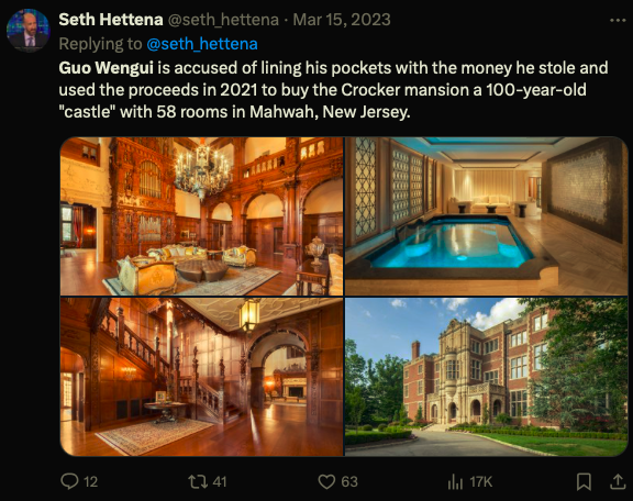 Prokuratorzy oskarżyli Guo o zebranie ponad miliarda dolarów od swoich followersów. Ci dołączyli do jego inwestycyjnych i kryptowalutowych programów między 2018 a 2023 rokiem. Zebrane pieniądze wykorzystywał do finansowania luksusowego stylu życia. W tym rezydencji o powierzchni 50,000 stóp kwadratowych, samochodu Lamborghini za milion dolarów i jachtu za 37 milionów dolarów.