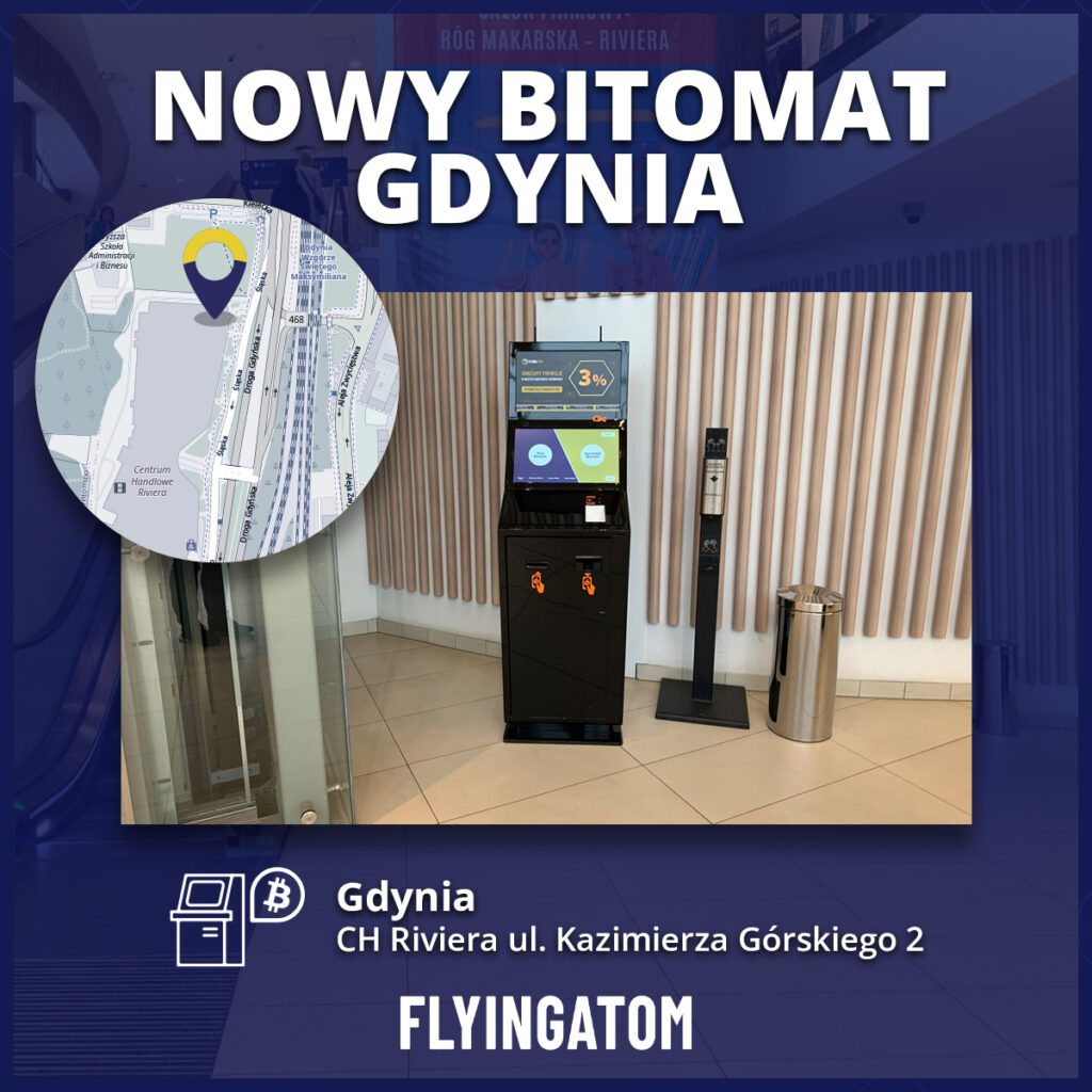 Nowy Bitomat w Gdyni został postawiony przez firmę FlyingAtom. FlyingAtom to kantor wymiany kryptowalut działający na rynku już od 2015 roku. Możemy w nim dokonać transakcji zakupu oraz sprzedaży Bitcoina lub innych najpopularniejszych kryptowalut. Kantor posiada swoje biura stacjonarne w 19 miastach w Polsce. Ostatnio sieć placówek zasiliło nowe biuro w Gdyni (Kantor kryptowalut otworzył placówkę w Gdyni), a od dziś możemy korzystać w tym mieście również z Bitomatu. FlyingAtom posiada w swojej sieci już 44 urządzenia, co czyni firmę jednym z największych operatorów w Europie.