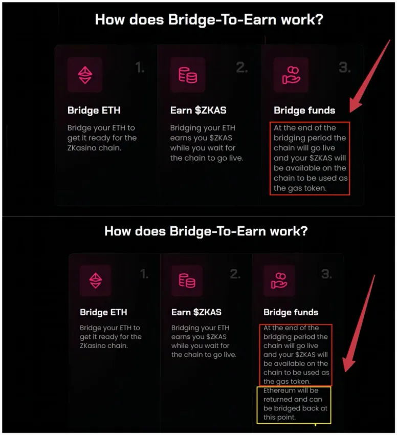 fot. ZKasinoJednak niedługo po tym ogłoszeniu na stronie głównej Zkasino usunięto kluczową obietnicę zwrotu zablokowanego Ethereum. Zamiast tego, w ramach „przysługi” dla użytkowników, zdecydowano o konwersji ETH na tokeny ZKAS, które miały zostać wycenione na 500 milionów dolarów w pełnej rozwodnionej wartości (FDV) oraz 5% przy pierwszej emisji tokenów (TGE). Dodatkowo 25% całkowitej podaży ZKAS miało zostać przydzielone osobom stakującym ETH, co miało rzekomo stanowić dla nich atrakcyjny zwrot z całej inwestycji.