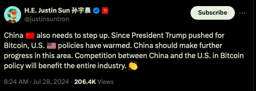 „Chiny powinny poczynić dalsze postępy w tej dziedzinie. Konkurencja między Chinami a USA w polityce dotyczącej Bitcoina przyniesie korzyści całej branży” – stwierdził Sun.