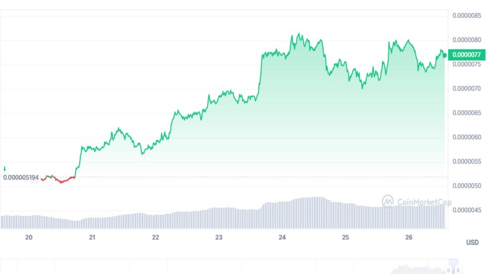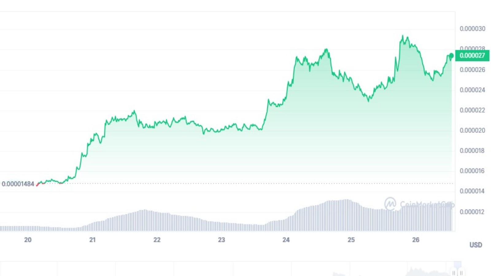 Moneta PEPE została po raz pierwszy wprowadzona do obrotu 15 kwietnia 2023 r. po cenie około 0,000000001 USD. w tej chwili jeden PEPE kosztuje zaś ok. 0,0000079 USD, co przekłada się na wzrost o ponad 13 000% od jego debiutu.
