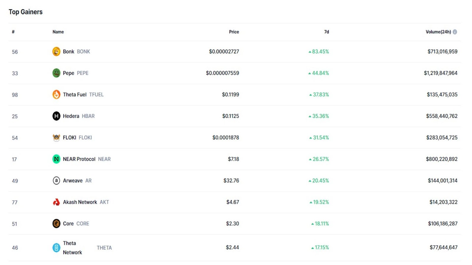 Okres ten do szczególnie udanych zaliczą memecoiny. Bonk, Pepe, Floki, Baby Doge Coin czy Popcat zyskały co najmniej kilkadziesiąt procent. W tym tygodniu podrożały też inne projekty krypto, w tym m.in. Hedera, Theta Fuel i NEAR Protocol.