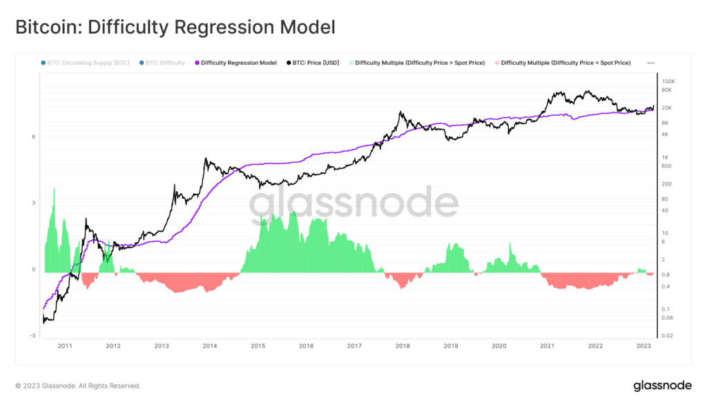 Źródło: GlassnodeModel regresji trudności jest jedną z prób oszacownia przez Glassnode całkowitego kosztu produkcji dla 1 BTC. Trudność to w tym przypadku całkowite koszty górników. Regresja pomiędzy kapitalizacja Bitcoina trudnością daje wartość R2, powyżej 0,95 – pokazuje to silny związek między wartością aktywów a kondycją górników. Cena pochodna zacunkowy średni koszt produkcji BTC w całym przemyśle wydobywczym. Wykres pokazuje, iż cena Bitcoina wzbiła się powyżej modelu regresji. Podobnie miało to miejsce w hossie 2013 i hossie 2021 roku.