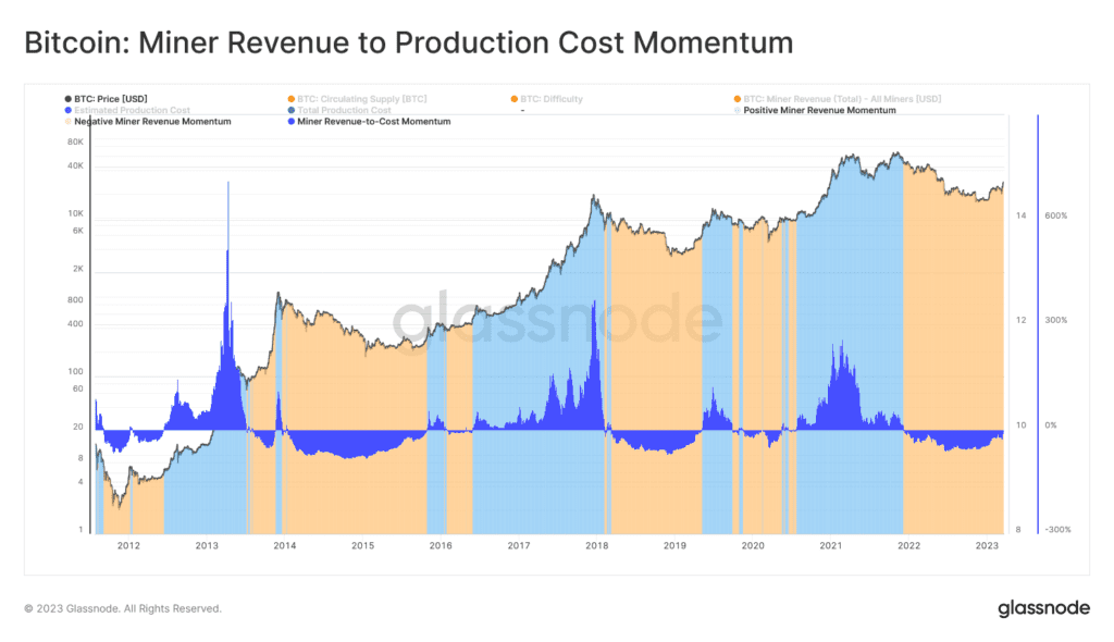 Źródło: GlassnodeW celu znormalizowania cykli, Glassnode stworzył stosunek wskaźnika przychodów do kosztów a jego roczną średnią ruchomą. Odzwierciedla t cykliczną dynamikę rentowności górnikó. Wskaźnik ocenia opłacalność górnika BTC w relacji do jej linii bazowej. Niebieski kolor – momentum większe od 0 – wskazuje, iż na rynku wydobycia BTC obserwowana jest poprawa przychodów w stosunku do średniej. Pomarańczowy kolor, gdy momentum jest poniżej 0 – branża jest pod presją słabszych od średniej przychodów.