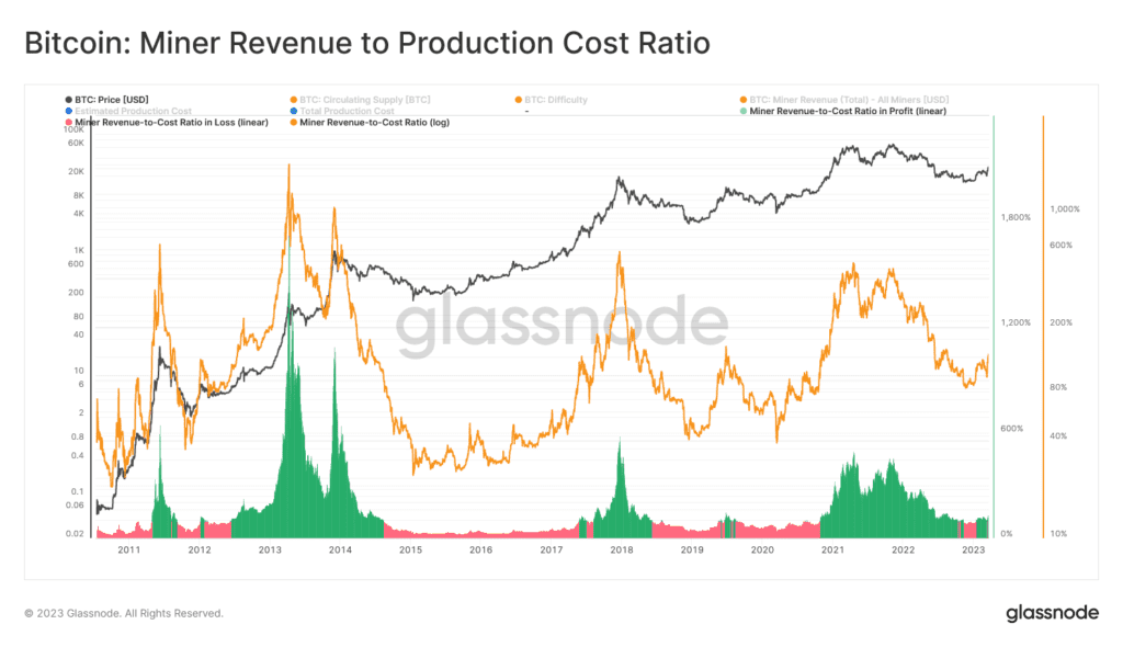 Źródło: GlassnodeGlassnode stworzył metrykę, która wskazuje średnią efektywność rynku górników BTC. Porównuja una generowane przychody do szacowanych kosztów produkcji. Ocenia w ten sposób formę wskaźnika Revenue-to-Cost Ratio. To metoda powszechnie stosowana do pomiaru efektywności podmiotu docelowego. Może być nim inna branża, w tym przypadku to branża wydobywcza Bitcoina. Widzimy, iż wartości wyższe od 100% (zielony) pokazują zyskowny rynek góniczy. Współczynniki przychodów do kosztów wyższe od 350% zwykle obserwowane są w szczycie manii. Wartości poniżej 100% (kolor czerwony) pokazują nierentowany przemysł BTC. Przychody spadają wówdczas do ok. 30 / 50% szacowanych kosztów produkcji. Warto pamiętać, iż mining wymaga rozważnego zarządzania majątkiem i aktywam, w otoczeniu konkurencji (np. platformy AISC).
