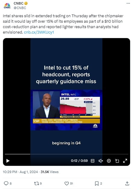 Źródło: https://x.com/CNBC/status/1819108114995544149Od początku roku firma straciła na giełdzie już około 40% na wartości, a niektórzy zaczynają się zastanawiać, czy Intela wciąż można określać mianem giganta technologicznego.