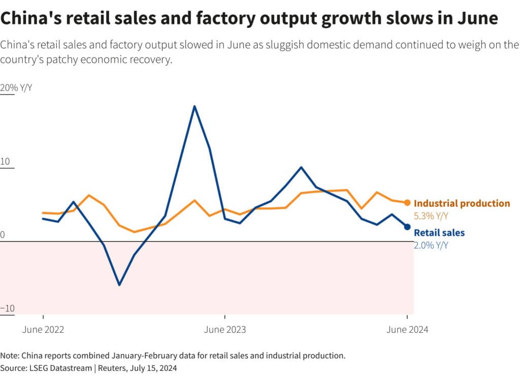 Sprzedaż detaliczna Chin w czerwcu 2024. Źródło: LSEG, Reuters