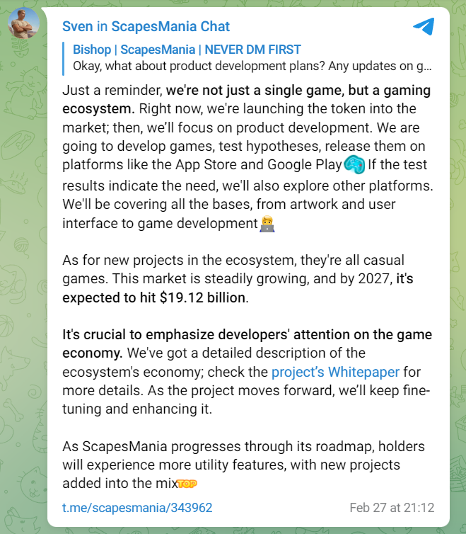 Działając w ramach ogromnej branży gier casualowych, która według Statista ma wzrosnąć do 19,12 miliarda dolarów do 2027 roku, ScapesMania jest gotowa wykorzystać ten wzrost. Obecna hossa, napędzana przez gwałtowny wzrost Bitcoina, sugeruje, iż nowy sezon altcoinów jest tuż za rogiem, a tokeny gamingowe mają spory potencjał.