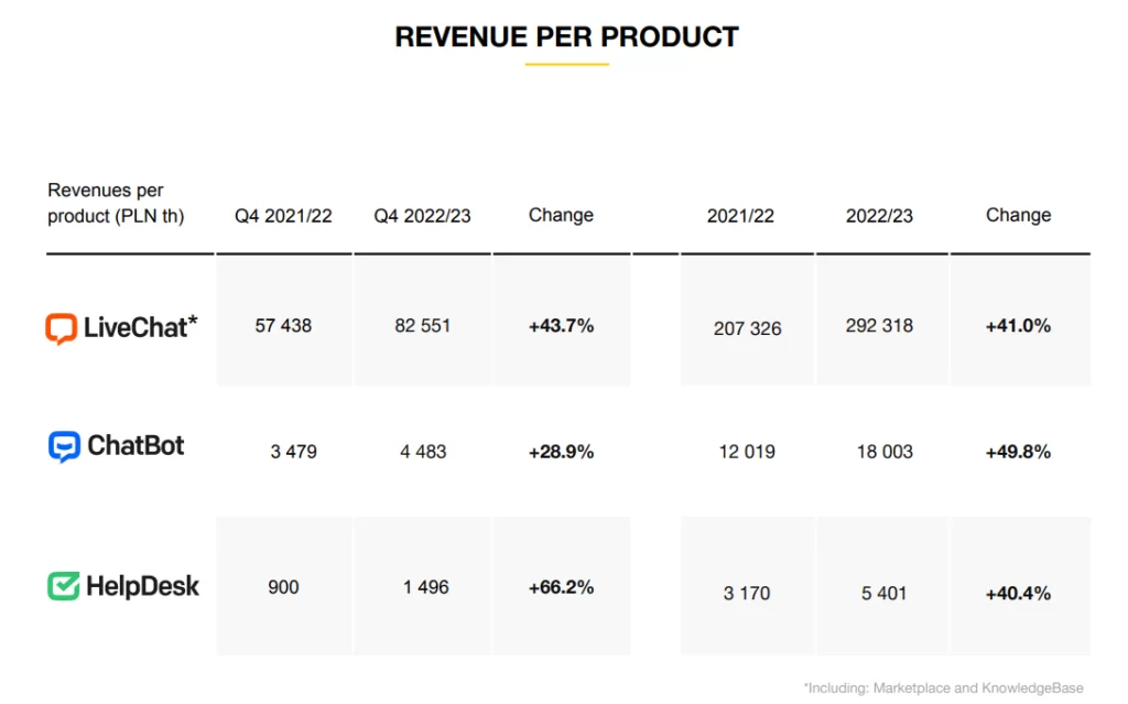 Głównym produktem spółki jest LiveChat. Jest to platforma, która umożliwia kontrakt z działem obsługi klienta dzięki kanału online. w uproszczeniu jest to usługa chatu z botem, który początkowo rozmawia z klientem. Pozostałe produkty nie są tak popularne i odpowiadają za ułamek przychodów firmy. Mowa tutaj o ChatBot (tworzenie chatbotów), Helpdesk (zarządzanie problemami klientów), KonwledgeBase (aplikacja z bazą wiedzy) oraz OpenWidget (instalowanie widżetów na stronie internetowej).
