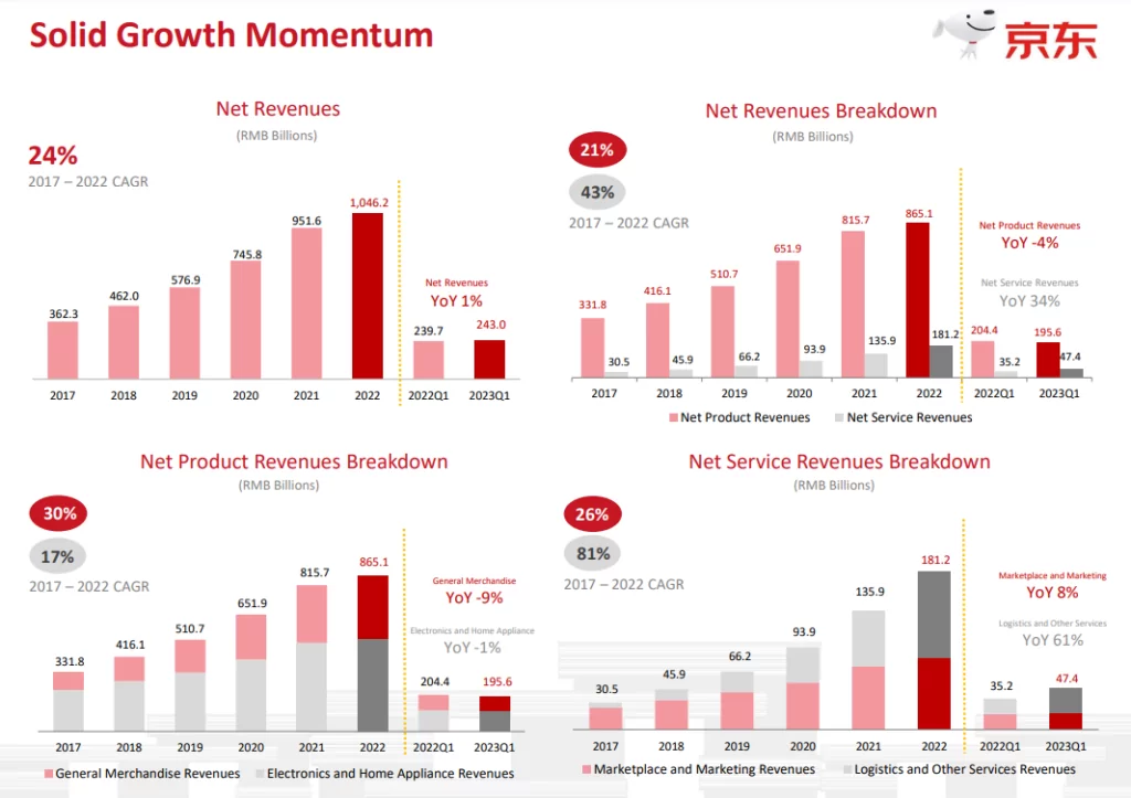 Przez wiele lat JD.com rozwijało się bardzo szybko. W latach 2017-2022 średnioroczna stopa wzrostu przychodów wyniosła 24%. Był to świetny wynik. Jednak w I Q 2023 roku przychody wzrosły zaledwie o 1%.