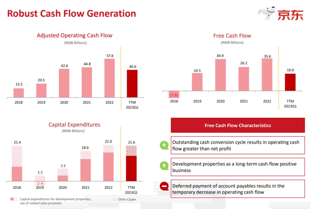 Źródło: JD.comOczywiście część przepływów operacyjnych wynika ze zwlekania z zapłatą kontrahentom (korzystanie z darmowego kredytu kupieckiego). W 2022 roku było to 11 mld RMB, natomiast w 2021 roku finansowanie się u dostawców odpowiadało za ponad 30 mld RMB. Jednak stabilne FCF świadczą o tym, iż firma nie potrzebuje kapitału do wzrostu. Nie musi się zadłużać i emitować akcji, aby kontynuować wzrost skali działania.