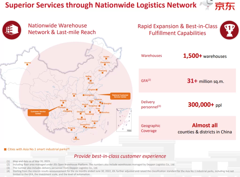 JD.com jest firmą, która działa w segmencie e-commerce. Na początku specjalizowała się w sprzedaży elektroniki przez internet. To, co odróżniało firmę od konkurencji to sieć własnej logistyki. Dzięki temu firma oferowała w dużych miastach dostawę w bardzo krótkim czasie. Dla wybranych produktów JD oferowała dostawę jeszcze tego samego dnia. Firma stawia na rozwój technologiczny. Testowane są automatyczne magazyny (rola ludzi zmniejszona do minimum), czy dostawę dronami albo zdalnie sterowanymi pojazdami ulicznymi. JD.com posiada ponad 1500 magazynów i zatrudnia 300 000 personelu związanego z logistyką. Jest to największa sieć tego typu w Chinach. Oczywiście taki model biznesowy jest kosztowny (konieczność ponoszenia dużych nakładów inwestycyjnych). Jednak pozwala to pogłębić swoją przewagę nad potencjalnymi konkurentami, którzy będą chcieli wejść na rynek e-commerce w Chinach.