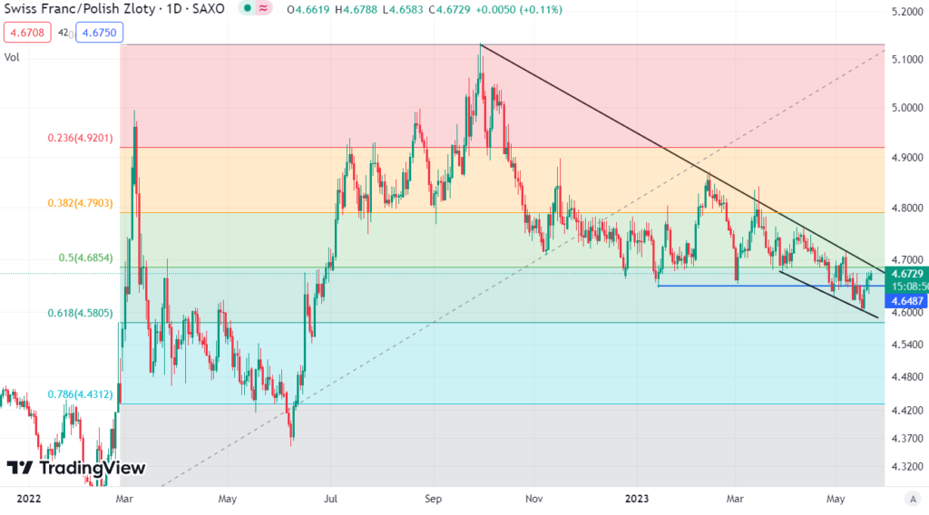 Kurs CHF/PLN w końcu przełamał minimum z 13 stycznia 2023 roku (4,645). W efekcie nastąpił szybki spadek kursu franka szwajcarskiego 4,605. Oznaczało to, iż pokonane zostały ważne wsparcia, jakim był dołek z 27 czerwca 2022 roku (4,615). Bardzo gwałtownie frank szwajcarski powrócił do formy. Bardzo gwałtownie nastąpił powrót powyżej 4,645. w tej chwili kurs CHF/PLN znajduje się blisko ograniczenia trendu spadkowego, który jest poprowadzony po szczytach z 29 września 2022 i 15 lutego 2023 roku. Jego przebicie umożliwi bykom test poziomu 4,76, czyli szczytu z 11 kwietnia 2023.