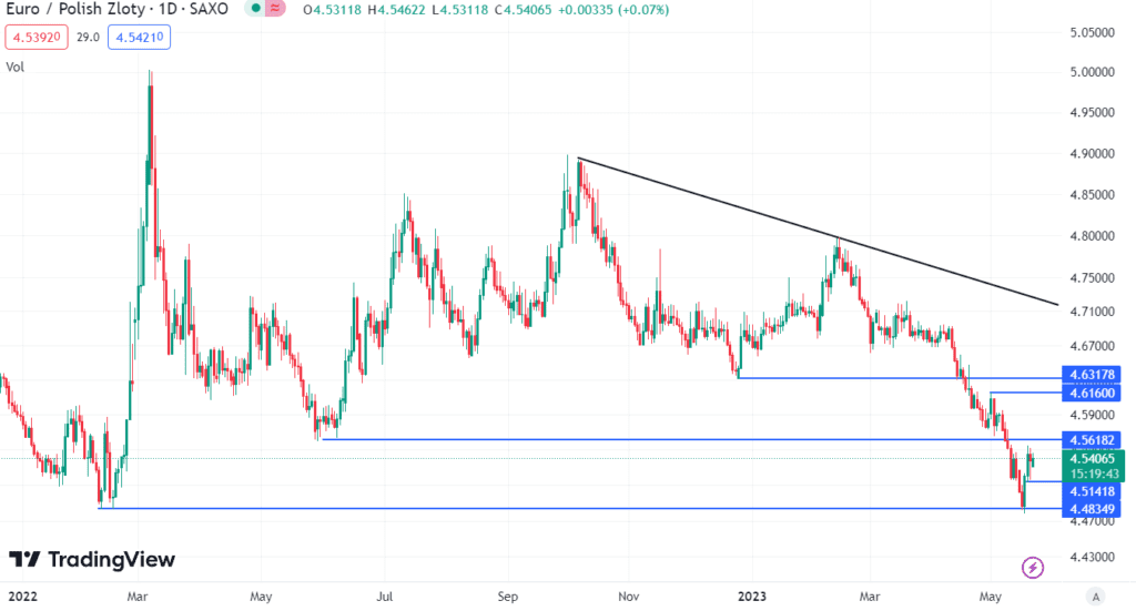 Kurs EUR/PLN po przebiciu majowego dołka (4,56) ruszył na południe. W ciągu kilku dni przebił ważne wsparcia, jakimi były poziomy 4,52 i 4,50. Podczas ruchu kulminacyjnego kurs EUR/PLN przetestował dołek z 10 lutego 2022 roku (4,482). Jednak skala umocnienia złotego była na tyle mocna, iż prosiło się o wzrostowe odreagowanie. To nastąpiło na sesji z 17 maja 2023.