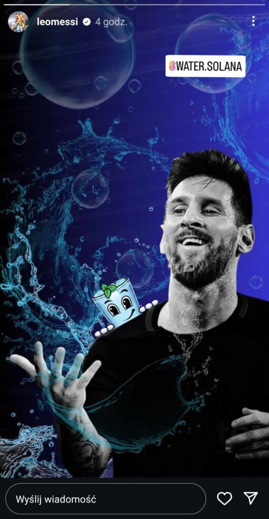 Wczoraj Leo Messi na swoim oficjalnym koncie na Instagramie wstawił relację z grafiką, z której wynika, iż nawiązał nową współpracę z kryptowalutowym projektem. Na relacji widnieje postać piłkarza oraz logo i znacznik do projektu WaterCoin (WATER).
