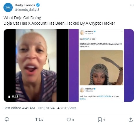 Źórdło: https://x.com/trends_dailyU/status/1810504397061038317Fałszywy post na X przedstawiał raperkę w zbroi, wymachującą mieczem. Nad obrazkiem widniał napis „kup $DOJA albo inaczej”, po nim umieszczono adres fałszywego tokena. Poniżej obrazka pojawił się napis, który odnosił się do Iggy Azalei, która kilka tygodni temu również padłą ofiarą podobnego oszustwa. Tekst w niecenzuralnych słowach wzywa do ignorowania wspomnianej raperki i nakłania do zakupu DOJA.