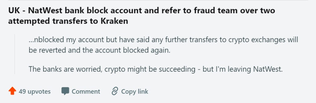Jeden z użytkowników „usług” (termin umowny – NatWest wydaje się wychodzić z założenia, iż to klienci mają mu usługiwać swoimi pieniędzmi, nie na odwrót), które oferuje bank, podzielił się na portalu Reddit swoim doświadczeniem. Według jego relacji, gdy próbował kupić kryptoaktywa, NatWest… odmówił. Po prostu nie i już.