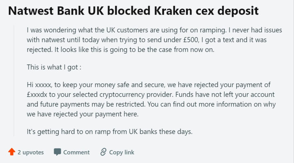 Nie chodzi o to, iż bank nie wiedział, o co chodzi, i „obawiał się” scamu wymierzonego w klienta. Ten bowiem chciał skorzystać z giełdy Kraken (co wiąże się z całym inwigilacyjnym i odzierającym z godności reżimem KYC). Nie chodzi też o jakąś gigantyczną kwotę, która uzasadniałaby ostrożność. Klient chciał bowiem przelać raptem 500 funtów.