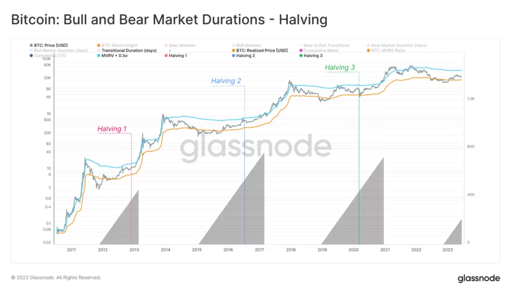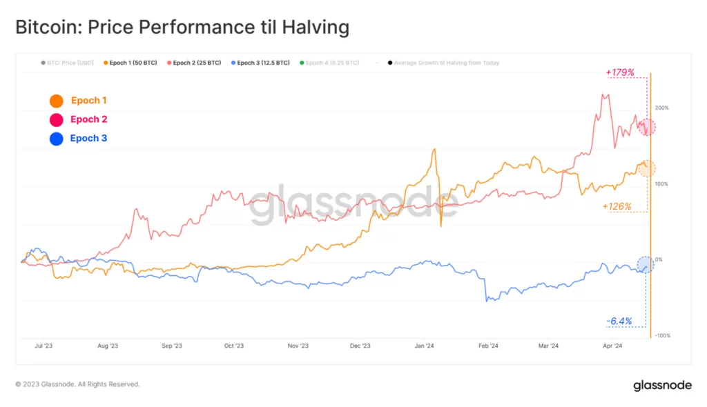 Glassnode skończył analizę oceną wyników cenowych w ciągu roku następującego po każdym z poprzednich halvingów.