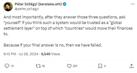 Źródło: https://x.com/peter_szilagyi/status/1816868698449498543Dalej programista pisze, iż jeżeli „Twój” ostateczna odpowiedź brzmi nie, to powinniśmy zadać sobie pytanie, czy taki system byłby zaufany jako „globalna warstwa rozliczeniowa”, na którą państwa przeniosłyby swoje finanse. Dalej Szilágyi, pisze: „Ponieważ jeżeli Twoja ostateczna odpowiedź brzmi „nie”, oznacza to, iż ponieśliśmy porażkę”.