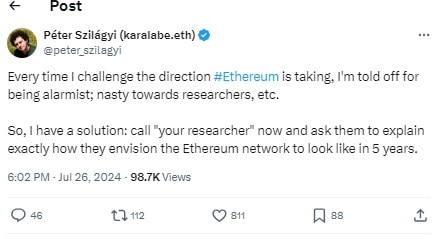 Źródło: https://x.com/peter_szilagyi/status/1816866803706110285Szilágyi, nie zważając na słowa, napisał: „Badania nad Ethereum mordują graczy domowych na oczach wszystkich. […]To nie jest coś, na co się pisałem, dołączając do Ethereum”.
