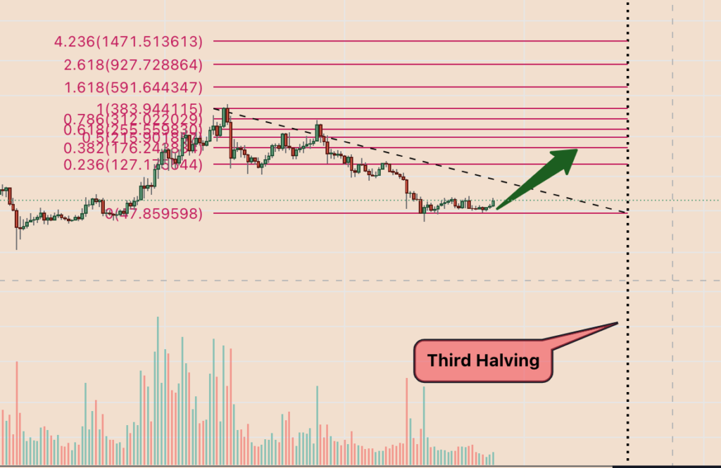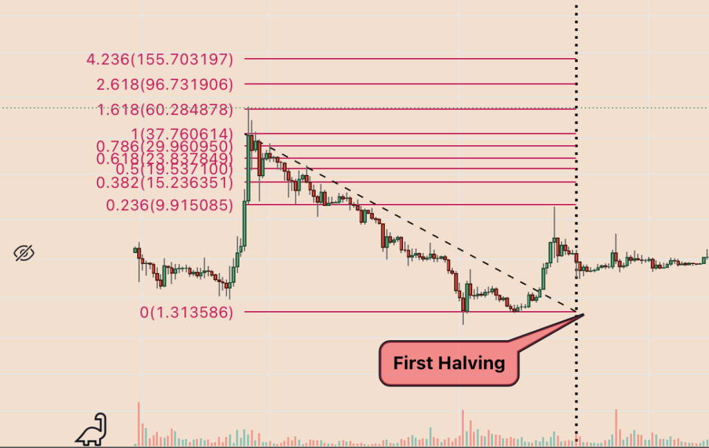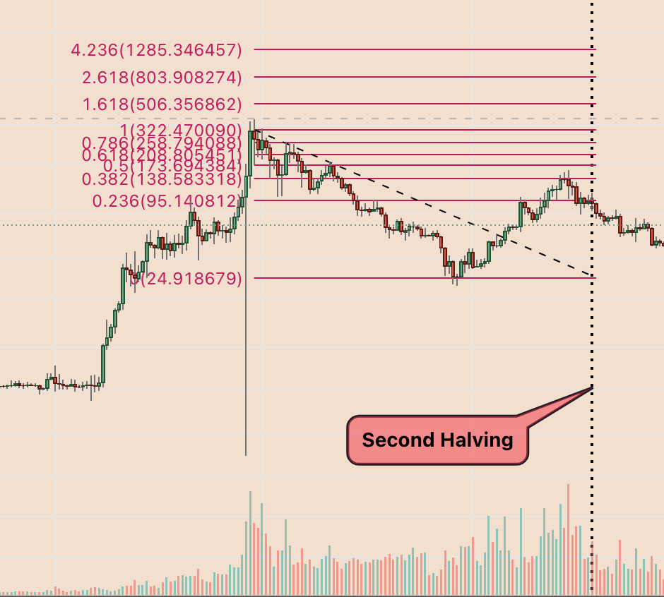 Rysowanie wykresów zniesienia Fibonacciego pomiędzy szczytami i dołami korekty Litecoina sprzed halvingu wskazuje na prawdopodobieństwo przetestowania linii Fibonów 0,236 i 0,382 jako ich celów zwyżkowych.