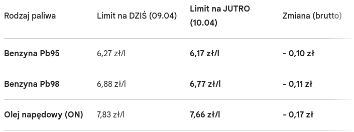 Mimo skromnej reakcji hurtu, mechanizm cen maksymalnych wymusił obniżki na pylonach. Poniżej oficjalne zestawienie limitów na dziś oraz na jutro:
