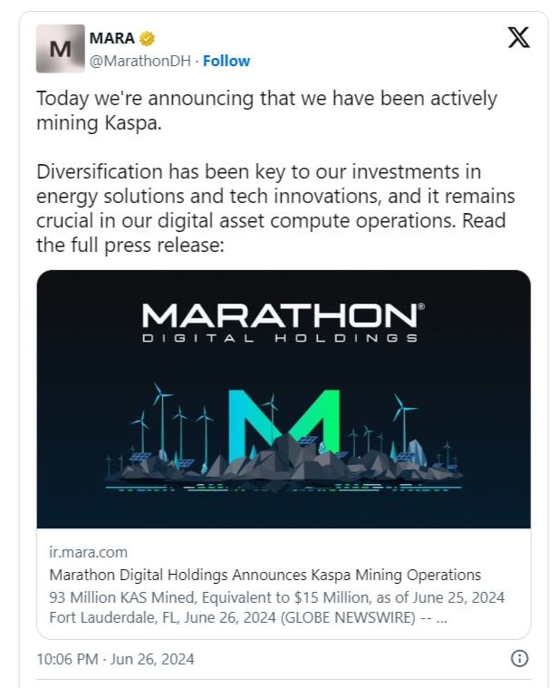 Marathon wydobył 93 miliony tokenów KAS od czasu wdrożenia pierwszej partii górników Kaspa we wrześniu 2023 roku. Od tego czasu wartość tokenów KAS wzrosła o 420 proc, podczas gdy cena Bitcoina wzrosła o 135 proc. Należy również odnotować, iż Marathon zakupił około 60 petahashów układów KS3, KS5 i KS5 Pro ASIC do wydobywania tokenów KAS. Połowa z nich jest w tej chwili uruchomiona, podczas gdy pozostała część zostanie zainstalowana w trzecim kwartale.