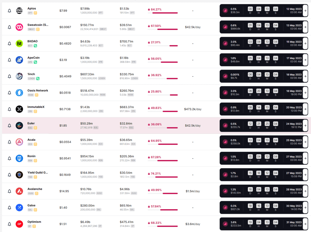 W maju 2023 roku zaplanowano według kalendarza kryptowalutowego 21 zdarzeń polegających odblokowania tokenów, które uwolnią lub już uwolniły do obiegu tokeny o wartości ponad 794 milionów dolarów.