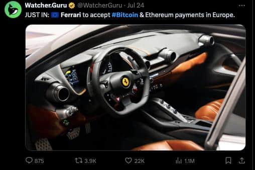 Wejście Ferrari na rynek europejski następuje po udanym uruchomieniu systemu płatności kryptowalutowych w Stanach Zjednoczonych w październiku 2023 roku. Firma nawiązała współpracę z BitPay, aby przetwarzać transakcje w Bitcoinie (BTC), Ethereum (ETH) i Stablecoinie USD Coin (USDC) podczas początkowego wdrożenia w USA.
