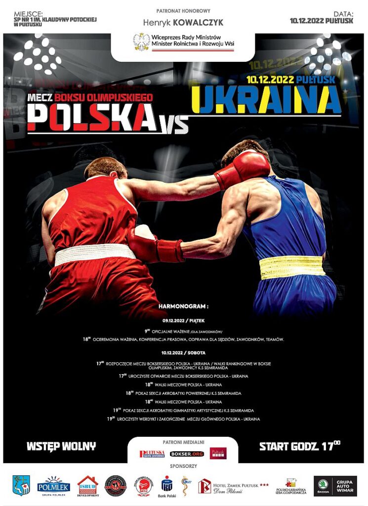 W sobotę 10 grudnia zapraszamy do hali szkoły podstawowej nr 1, im. Klaudyny Potockiej w Pułtusku gdzie o godzinie 17:00 rozpocznie się międzypaństwowy mecz pomiędzy reprezentacją Polski i Ukrainy. Na ringu w Pułtusku zobaczymy najlepszych kadetów i młodzików w dziesięciu walkach boksu olimpijskiego.