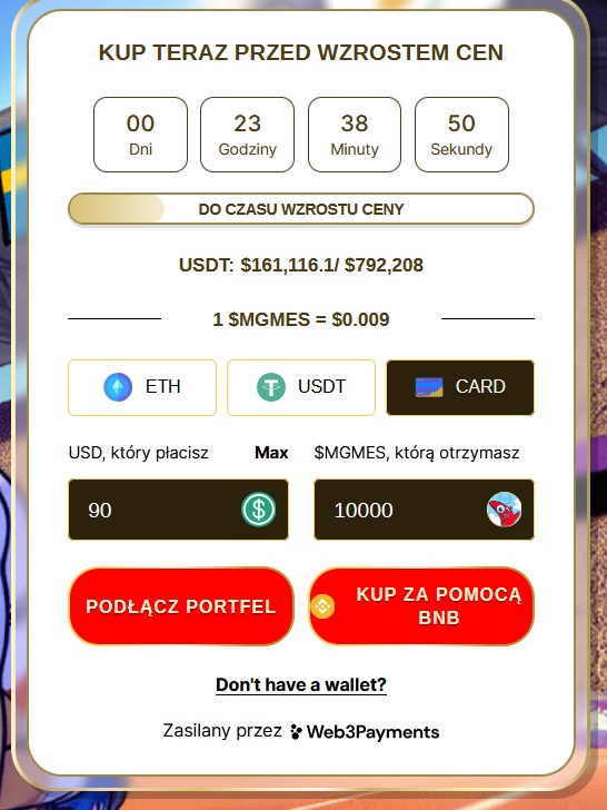 Zakup tokenów $MGMES jest prosty. Przede wszystkim należy mieć portfel kryptowalutowy kompatybilny z Ethereum (np. Best Wallet czy MetaMask) z walutami ETH, BNB lub USDT. W celu zakupu monet należy połączyć portfel z projektem przyciskiem na stronie, a następnie wskazać rodzaj i ilość waluty do wymiany na tokeny $MGMES. Ostatnim etapem jest potwierdzenie transakcji. Potem wystarczy już tylko wybrać swojego sportowca, poczekać na rozstrzygnięcie rywalizacji i zacząć stakować tokeny.
