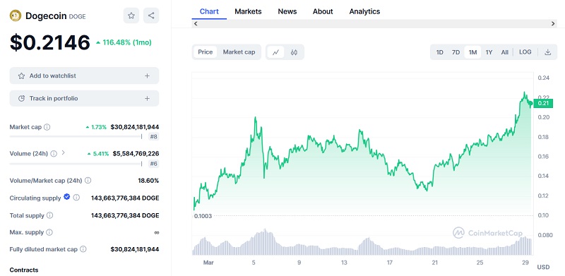 Jeden $DOGE kosztuje dziś około 0,215 USD. Natomiast cała kapitalizacja rynkowa przekroczyła już 30 000 000 000 USD. Aktualnie Dogecoin radzi sobie bardzo dobrze i w tydzień token podrożał o ponad 35% (około +120% w miesiąc). W ostatnich godzinach obserwujemy duże zaangażowanie inwestorów w Dogecoina, dlatego Wielkanoc może być dobra dla tej monety.