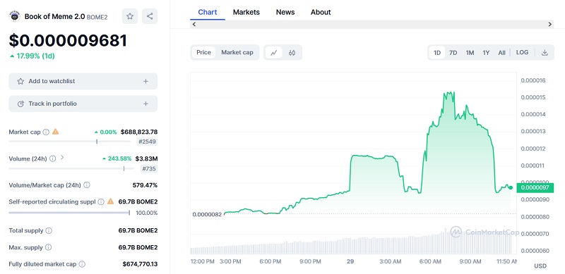 Okres świąt Wielkiej Nocy może być dobry także dla innych memecoinów. Za przykład niech posłuży token Book of Meme 2.0 ($BOME2). To nowy token giełdowy, który od czasu debiutu nieco się osłabił, natomiast aktualnie budzi ogromne zainteresowanie. Otóż w chwili pisania artykułu wolumen obrotu w ostatnich 24 godzinach osiągnął niemal 4 000 000 USD. Nic więc dziwnego, iż token w tym czasie podrożał o blisko 18% i może dalej kierować się na północ.