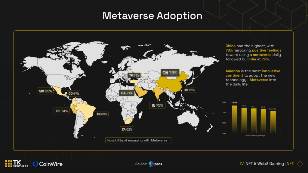 Według ankiety Stany Zjednoczone zajmują pierwsze miejsce pod względem innowacji w technologii Metaverse. Jednak Chiny i Indie zajmują czołowe miejsca pod względem pozytywnego nastawienia do codziennego korzystania z Metaverse, odpowiednio 78% i 75%, jak pokazano powyżej.